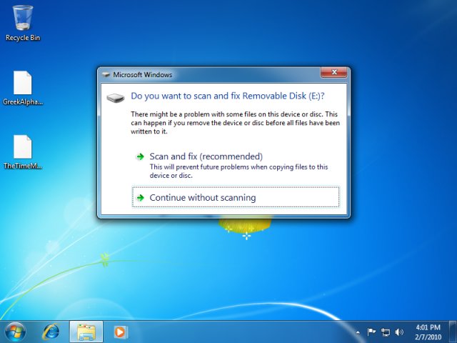 - Windows 7 may present the following prompt about scanning the device or disk
