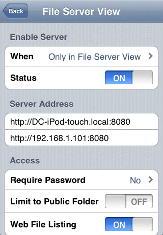 1. You should now see the File Server View screen. The Status should show that the file server is ON and the Server Address section should show at least two lines, each line being a possible address that you can use to access the iSilo™ file server. The first line will be the Bonjour address and the second line will be the numeric IP address.